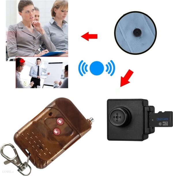 Mini kamera cyfrowa – guzik sterowana pilotemGadżet rodem z filmów o specjalnych agnetach, i tajnych misjach! Już teraz może być Twój, kamera zaprojektowana do montażu zamiast guzika w koszuli, marynarce itd. Najważniejsze cechy produktu:✅Zdalnie sterowana pilotem ➡️ możliwość włączenia i wyłączenia nagrywania bezprzewodowo✅Jedna z najmniejszych i najbardziej dyskretnych kamer na rynku.✅Obiektyw w kształcie guzika ➡️+ 4 guziki do wszycia nikt nie zauważy różnicy✅Świetna jakość nagrań ➡️ obraz w rozdzielczości FullHD✅Banalnie prosta obsługa bez skomplikowanej konfiguracji ➡️ ładujesz, wkładasz kartę pamięci włączasz i nagrywaszProdukt wysokiej jakości, świetnie oceniany przez klientów.⭐⭐⭐⭐⭐Kamera której nikt nie zauważySprytna niewielka kamera której nie widać, to marzenie każdego tajnego agenta lub szpiega. Dziś dzięki zaawansowanej technologii i miniaturyzacji może być Twoja. Za pomocą tej kamery można dyskretnie zarejestrować spotkanie, ważną rozmowę bez obaw że ktoś się domyśli że posiadasz przy sobie kamerę i utrwaliłeś rozmowę.Sterowanie bezprzewodoweKamera jest mega prosta w obsłudze, a sterowanie za pomocą pilota umożliwia w wygodny sposób rozpoczęcie i zakończenie nagrywania. W kamerze podczas pracy nie świecą żadne diody, które mogły by ją zdradzić, włączenie nagrywania jest sygnalizowane wibracją, wyłączenie również jest sygnalizowane wibracją. Pilot który jest dołączony do zestawu wygląda jak do sterowania samochodowym alarmem lub pilot do bramy.Obiektyw w kształcie guzikaKamera posiada obiektyw który jest zamaskowany w guziku, wygląda identycznie jak zwykły guzik a w zestawie znajdują się 4 guziczki o tym samym wzorze. Takie rozwiązanie umożliwi totalne ukrycie kamery i wkomponowanie jej w strój. Szczególnie polecamy jej montaż w koszuli, kieszonce bluzki.Opis zewnętrzny kamery i pilotaAntenaPrzycisk wyłączPrzycisk włączKontrolka wzkazująca naciśnięcie przyciskuObiektyw Slot karty pamięciGniazdo microUSB do ładowania kamerya) wysokość 14mmB) długość 30mmSpecyfikacja technicznaczas pracy: około 90 minutobsługa kart pamięci: microSD do 128GB (brak karty w zestawie)Funkcja nagrywanie w pętli – nadpisuje najstarsze nagrania nowymizasięg pilota: około 3 metrówpojemność akumulatora: 250mAhkąt obiektywu: około 70°jakość wideo: FullHD 1920 x 1080rozpoczęcie i zakończenie nagrywania urządzenie sygnalizuje wibracjamiZawartość zestawukamerapilot do sterowania kamerąkabel USB do ładowania4 guziki, które mają taki sam kształt jak obiektyw kamery