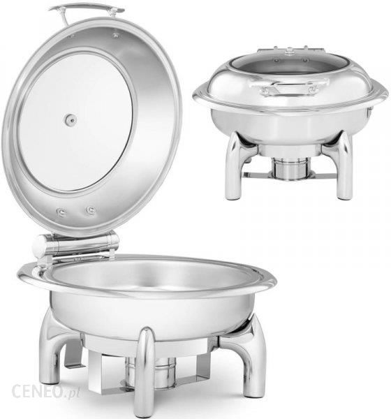 Kod producenta: 10012405Podgrzewacz do potraw marki Royal Catering sprawdzi się w hotelowych bufetach oraz na imprezach z cateringiem. Wykonany został ze stali nierdzewnej, solidnej i nie wchodzącej w reakcje z żywnością. Posiada dużą pojemność 5,5 l, za sprawą pojemnika o wymiarach śr. 390 mm i głębokości 65 mm. Żaroodporna rączka zapobiega poparzeniu. Pokrywa jest odchylana, co ułatwia nakładanie żywności. Okienko ze szkła hartowanego w pokrywie pozwala podejrzeć zawartość bez konieczności otwierania. Podgrzewacz zasilany jest paliwem. W komplecie znajduje się pojemnik na specjalną pastę z pokrywką ułatwiającą zgaszenie płomienia. Instaluje się je pod zbiornikiem na wodę o wymiarach ś. 450 x 95 mm. Kąpiel wodna utrzymuje potrawy w cieple i nie przypala ich.Cechy produktu:- Do utrzymywania w cieple potraw, – Kąpiel wodna nie przypala żywności,- Równomierne rozprowadzanie ciepła utrzymuje wysoką temperaturę przez długi czas,- Stabilnie umiejscowiony pojemnik na paliwo,- Łatwy w czyszczeniu i użytkowaniu.Parametry techniczne:- Model – RCCD-RT9_6L- Nr katalogowy – 10012405- Stan artykułu – Nowy- Napięcie [V] – — Pojemność [l] – 5,5- Głębokość pojemników na dania [mm] – 65- Materiał obudowy – Stal nierdzewna, hartowane szkło- Wymiary pojemnika na dania [mm] – Φ390 x 65- Pojemność pojemnika na wodę [l] – 8,5- Liczba pojemników na paliwo – 1- Materiał pojemnika – Stal nierdzewna- Wymiary wewnętrzne pojemnika na wodę [mm] – Φ450 x 95- Pojemniki na dania – Tak- Uchwyty boczne – Nie- Pojemniki na pastę – Tak- Pasta w zestawie – Nie- Pojemnik na wodę – Tak- Nienagrzewające się rączki – Tak- Podgrzewacz na pastę – Tak- Wymiary (DxSxW) [cm] – 52,5 x 46 x 29- Waga [kg] – 6,7- Wymiary wysyłki (DxSxW) [cm] – 52 x 49,5 x 43,5- Waga wysyłki [kg] – 9,6W zestawie:- Podgrzewacz do potraw- Pojemnik- Pokrywa- Pojemnik na paliwo- Instrukcja obsługi…