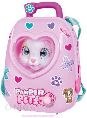 Plecak Pamper Petz to także walizka weterynarza, może być noszona przez dzieci za uchwyt lub jako plecak na plecach. Dziecko może przechowywać w nim, jak i zabierać ze sobą niezbędne akcesoria aby badać i leczyć swoje zwierzątko w każdej chwili. We wnętrzu plecaka znajduje się wyjmowana szuflada z akcesoriami lekarskimi, takimi jak stetoskop, strzykawka, termometr i inne. Szuflada może spełniać także funkcję łóżka dla zwierzątka, natomiast jeśli się ją odwróci, działa jak stół zabiegowy, a zwierzę może być leczone i uzdrawiane. Dzięki dołączonemu do zestawu arkuszowi naklejek, plecak można spersonalizować według własnego pomysłu. Zestaw nie zawiera zwierzątka.